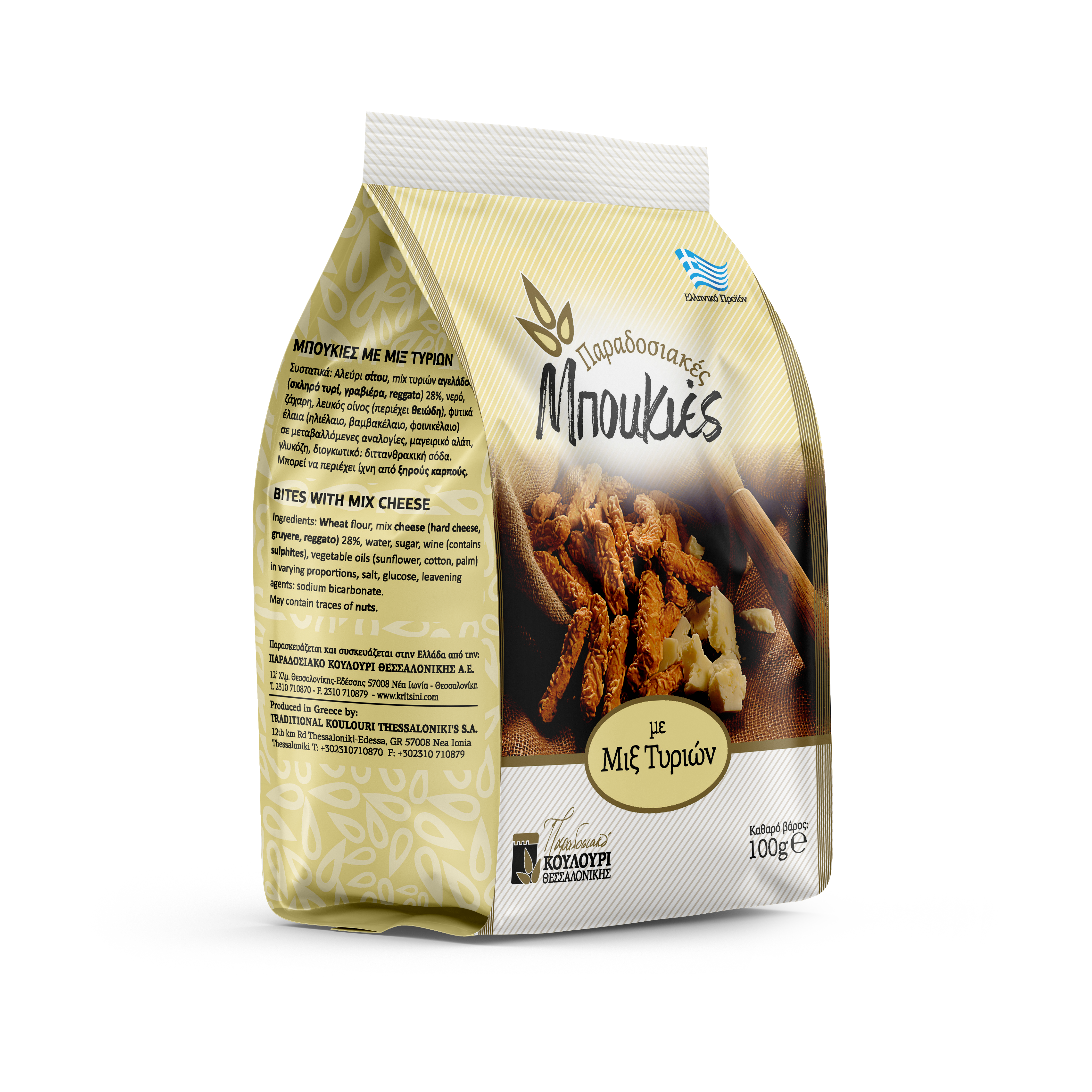 Ingredients: Wheat flour, mix cheese (hard cheese, gruyere, reggato) 28%, water, sugar, wine (contains sulphites), vegetable oils (sunflower, cotton, palm) in varying proportions, salt, glucose, leavening agents: sodium bicarbonate, emulsifier: mono and diglycerides of fatty acids (E471), acidity regulator: citric acid (E330), flavoring, preservative: potassium sorbate (E202), coloring: b carotene (E160A).