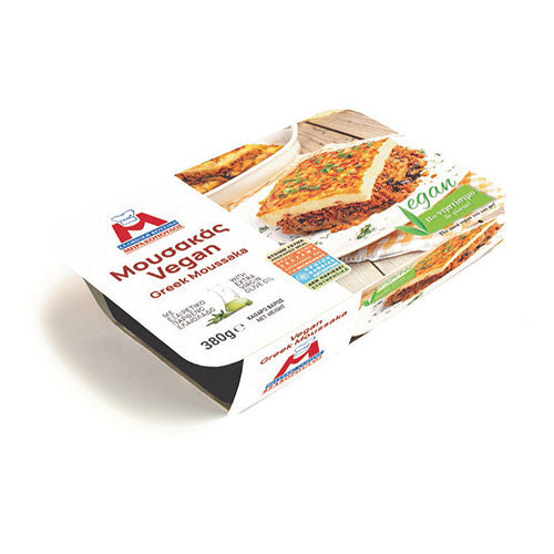VEGAN MINCEMEAT: Tomato sauce (chopped peeled tomato 70%), lightly concentrated tomato juice 30%, acidity regulator (citric acid), natural tomato juice-solid tomato juice ingredients 20%, onion, soybean, curd, vegan cheese, potato starch, modified potato starch, salt, flavourings, stabiliser (methylcellulose), pigments (β-carotene, riboflavin)], olive oil, parsley, white sugar, garlic and allspice. BÉCHAMEL VEGAN CREAM: modified starch, polydextrose, rice flour, maltodextrin, dextrose, salt, wheat fibre, stabilisers (cellulose gum, methyl-cellulose), onion, white pepper, nutmeg, flavourings, colourings (beta-carotene, riboflavin), olive oil, water, soybeans (14%), sugar, calcium and phosphorous mineral salts, stabiliser: gellan gum, almonds(2%), tricalium phosphate, emulsifier: sunflower lecithin, flavourings. Eggplants. Potatoes.