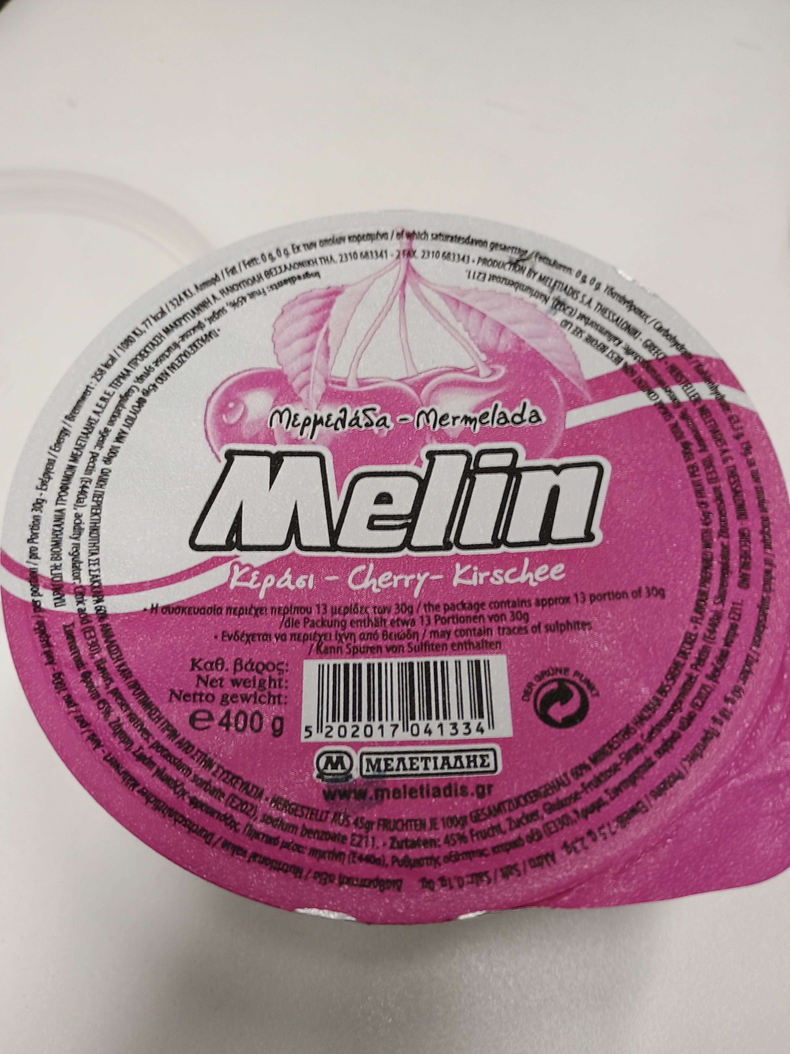 Cherry 70%, sugar, amyloid, gelling agent: pectin, acidity regulator: citric acid, natural flavor, traces of sulfur dioxide
